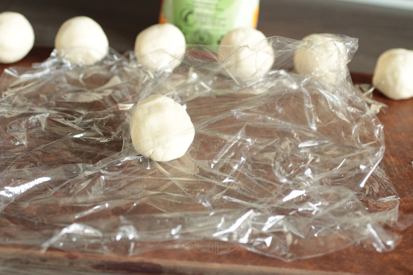 - Pak een klein bolletje (diameter 5 cm) van de grote bol deeg en in het midden van de folie.
