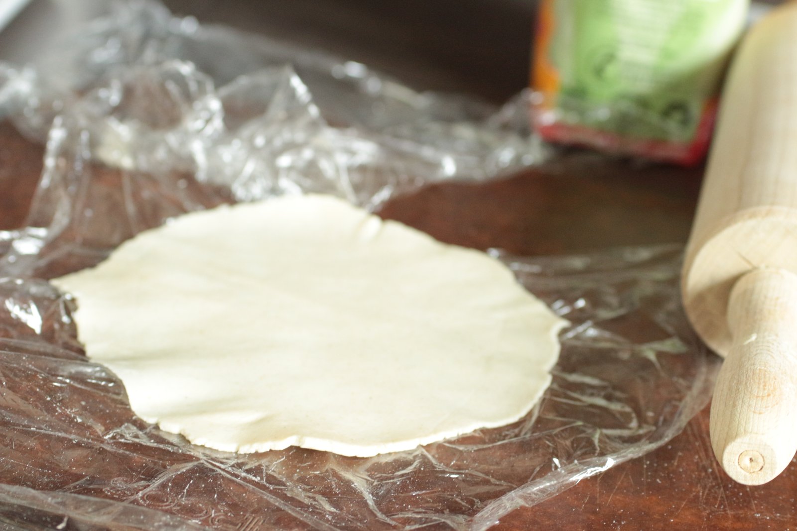 - Leg het tweede stuk folie op het deeg en maak deze plat door met de brede pan er op te drukken.