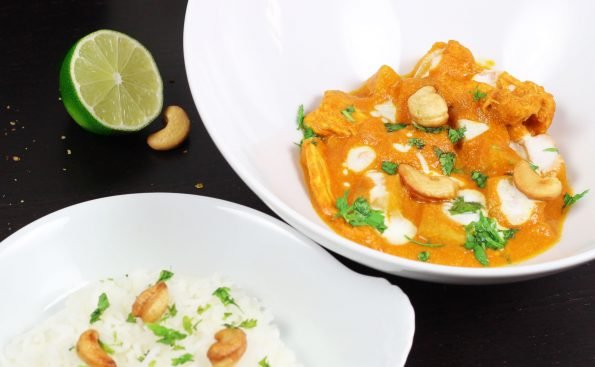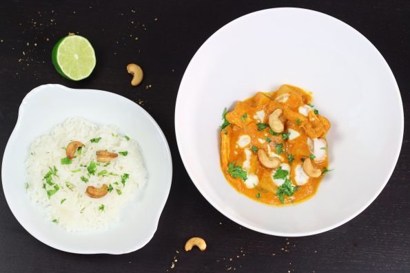 - Garneer zowel de rijst als de saus met koriander en de gebakken cashewnoten.